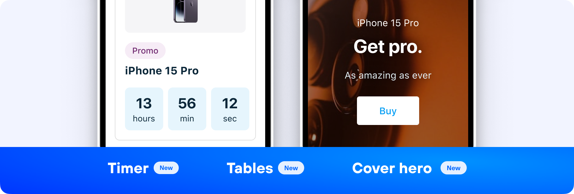 From now on, you can count on a Timer, because we know that every second counts. We have also added the Table component, ideal for organizing all your data efficiently. And last but not least, we introduce our new Cover Hero, the superhero that will make your covers stand out.
